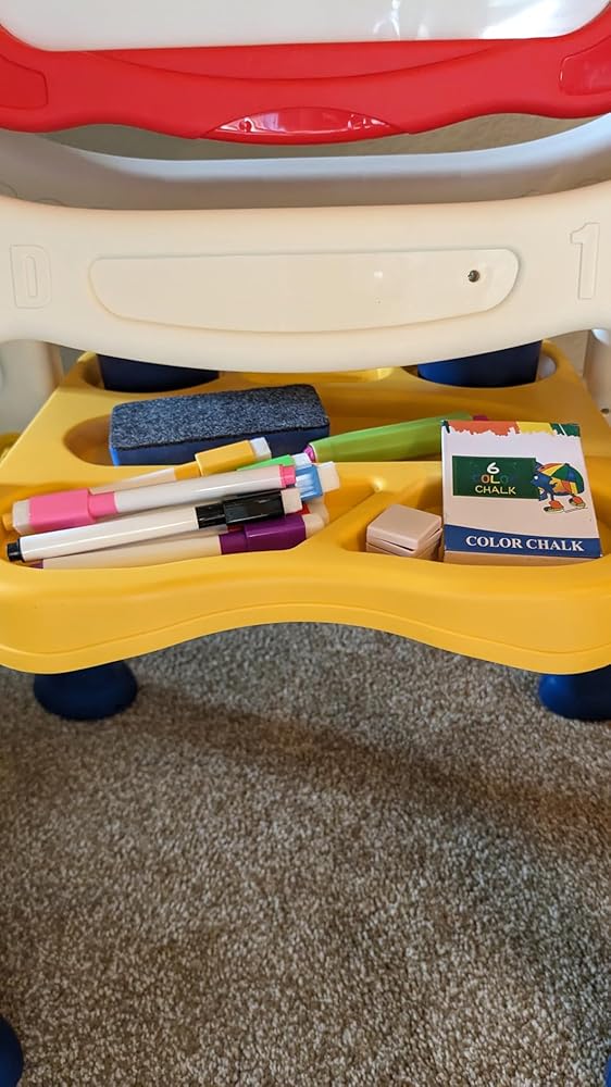 - 【Abundant Accessories】-- Considering the details of painting, we will provide a full set of parts for the children's art easel, including 1 roll of 16-inch drawing paper, 1 green storage box, 1 box of dust-free chalk, 4 markers (black, green, red and blue), 1 large eraser, colorful magnetic letters and a math set.