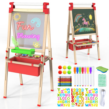 【POSITIVE GIFT FOR KIDS】Our kids art easel design has 3 adjustable heights, which means it can grow with children. Whether your child is a toddler or an older child, it will provide a comfortable and ergonomic drawing experience. A wood easel is an ideal practice area for children's first letters, numbers, words, and artistic drawing abilities.