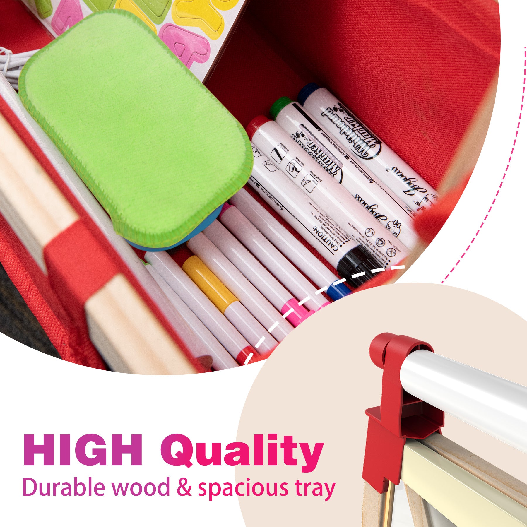 【Safety Material】The kids easel is made of high-quality pine wood, ensuring stability and durability, and can withstand years of play. Smooth wood without burrs and rounded corners are safe for infants. There is a fixed accessory on each side of the easel to increase its stability.