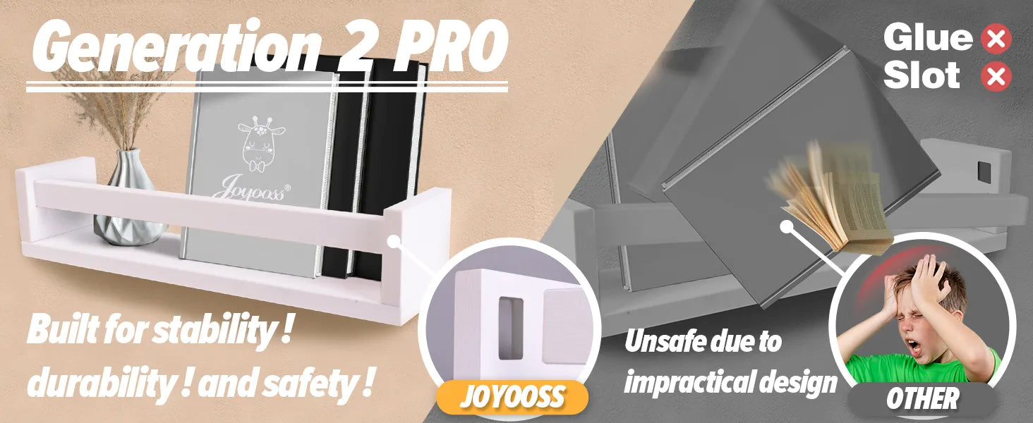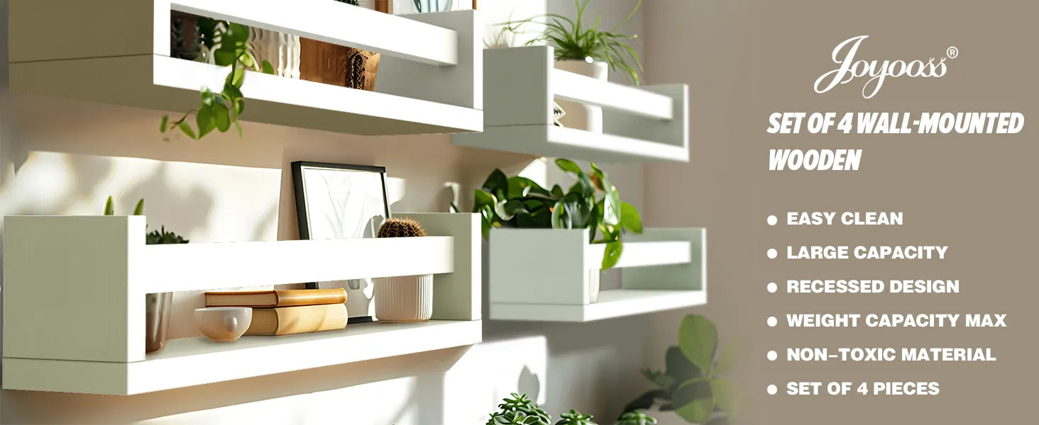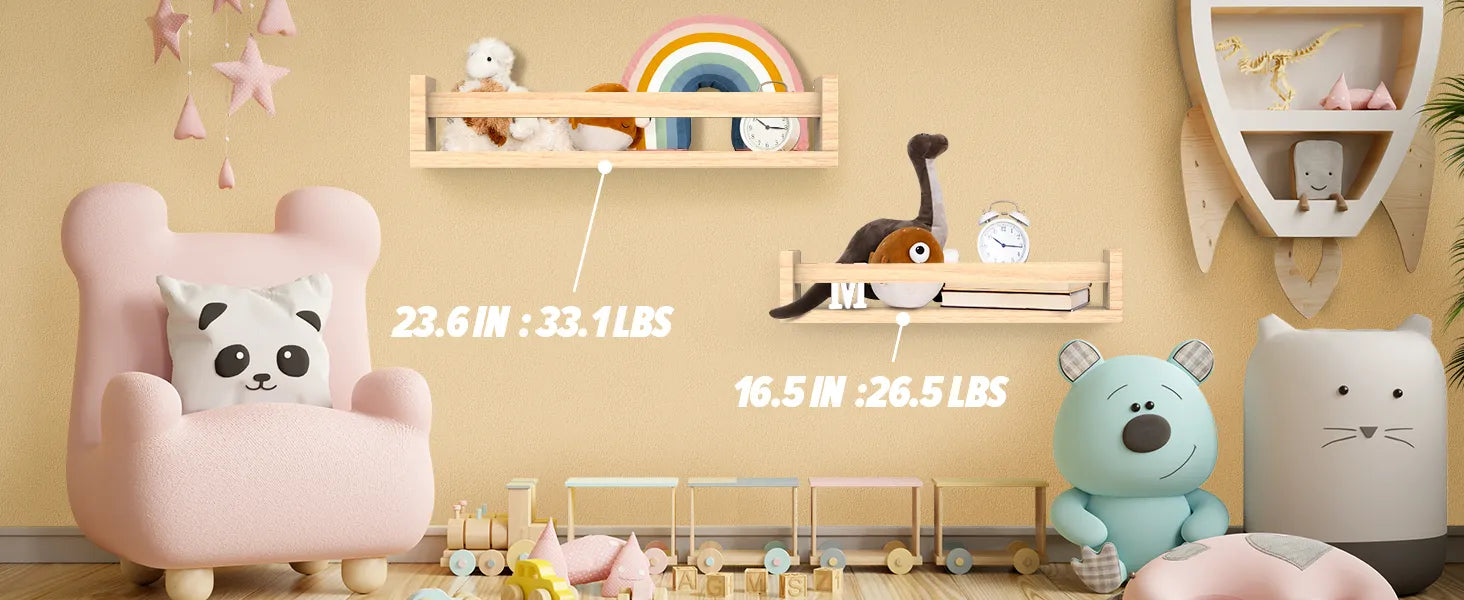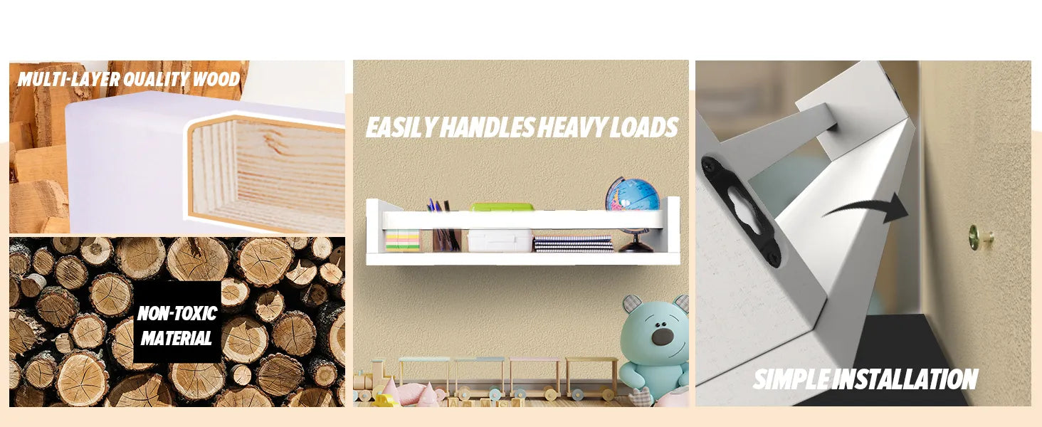 Safety First:Designed with your baby's and toddler's safety in mind, our shelves feature smooth edges and no protruding hardware. They can be installed at a height out of reach of young children, ensuring they are securely mounted on the wall and that items placed on them are stable and won't fall.